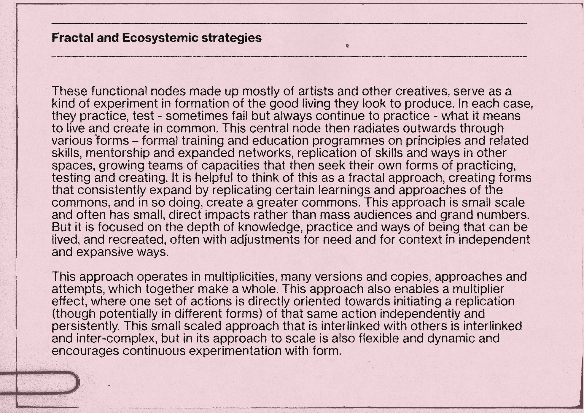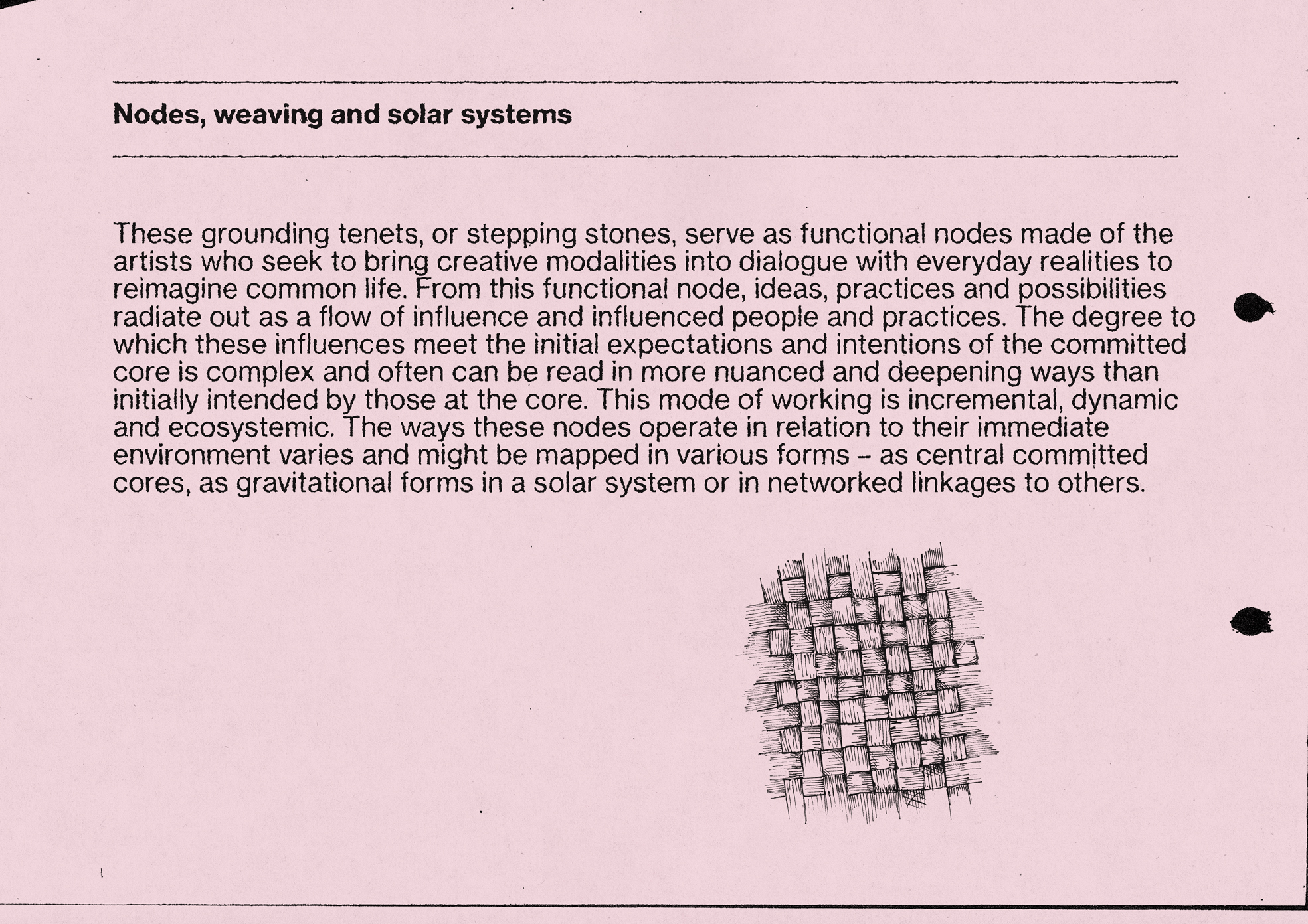 The project common life was conceived of by the ungovernable, an art and society project based in Johannesburg. It looks to learn from a number of arts initiatives around Africa that are dedicated to exploring the intersections between art practice and society - through amalgamating community life and artistic practice. Each arts initiative does this in very different ways, and deals with very different forms of creative practice, however they are all committed to a practice that is very grounded in its context, engages with African principles of ubuntu (or African humanism) and creativity. Overlayed in pink, over this summary, are some of the themes that have emerged across the project that tell us a bit about how some forms of contemporary creative practices are operating.
